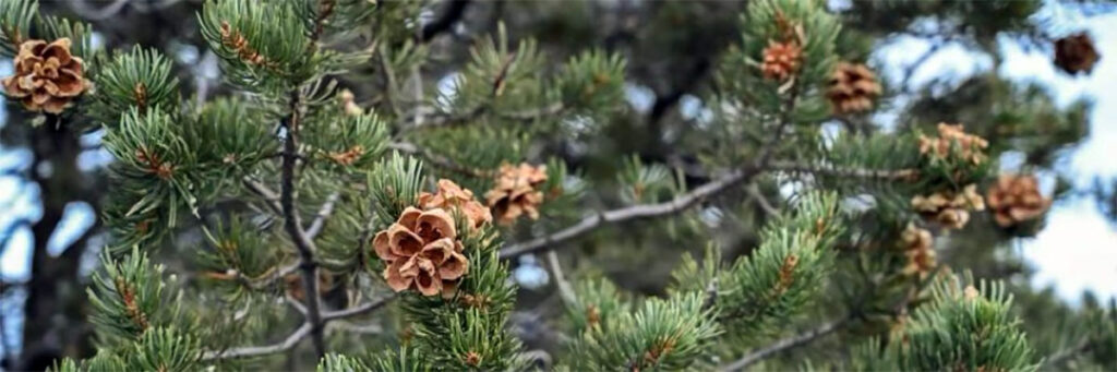 Pinyon pine cones have opened after ripening. The seeds have dropped or been foraged by wildlife.